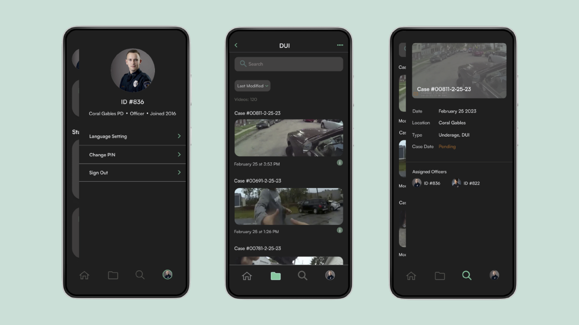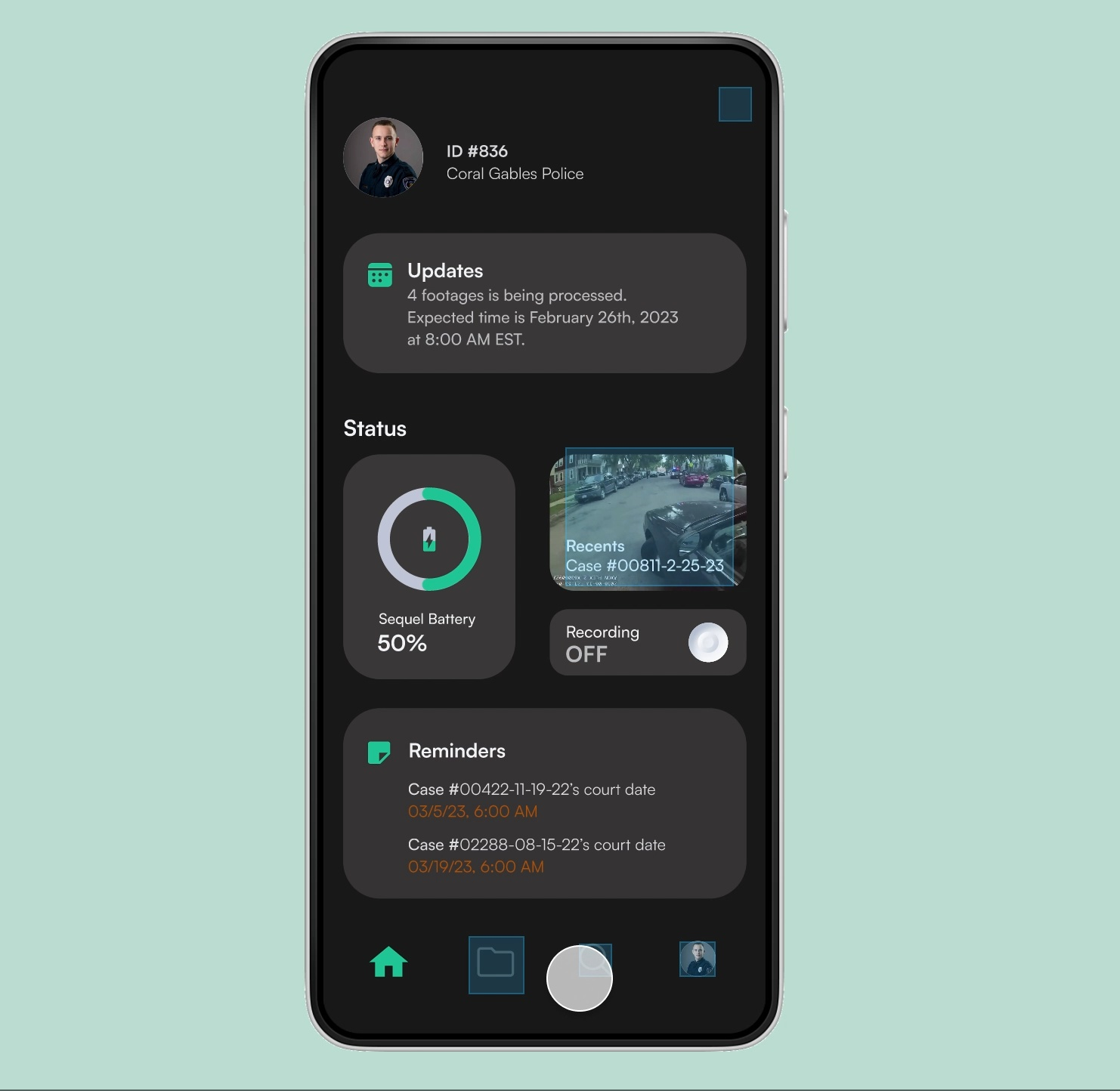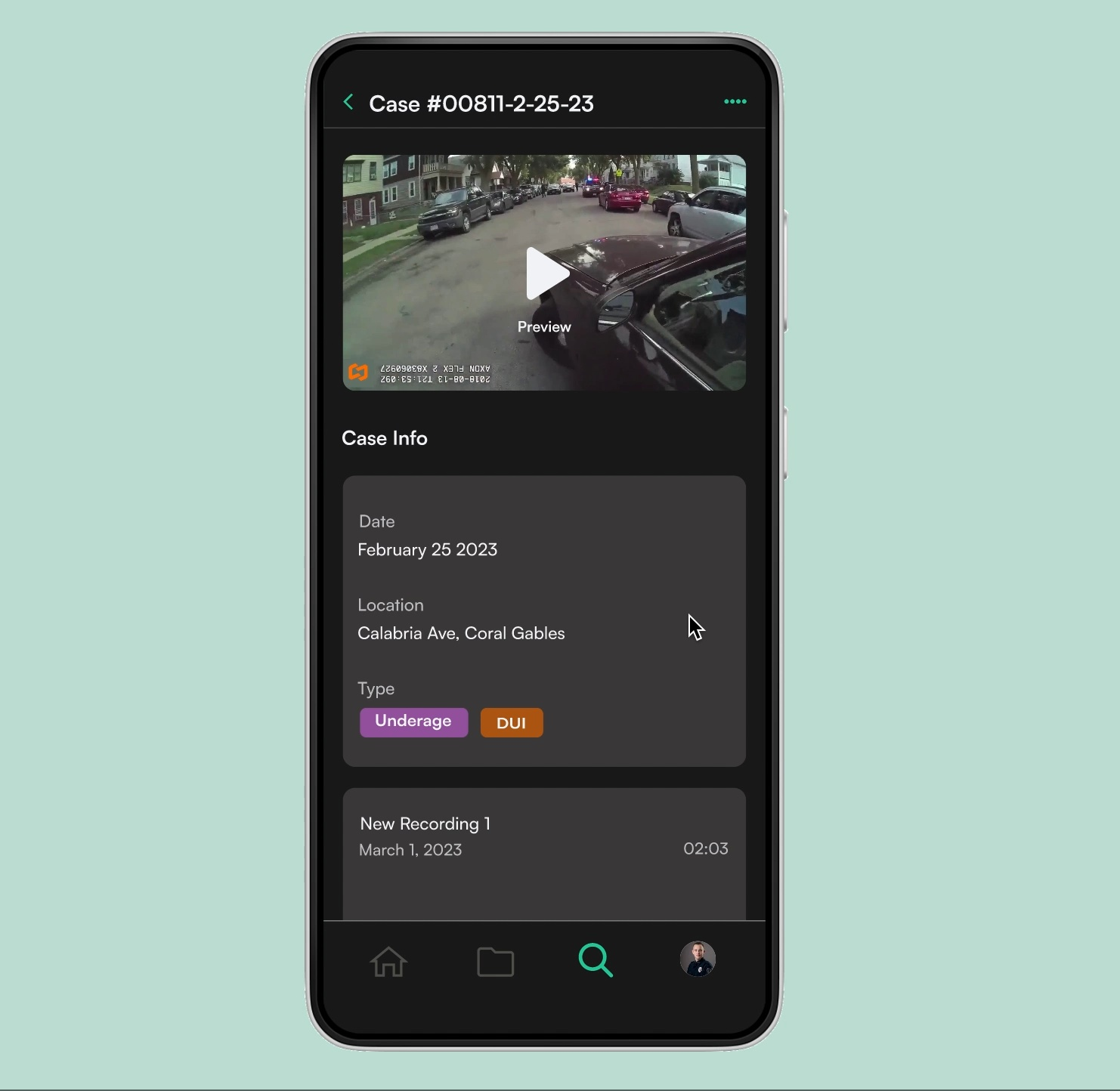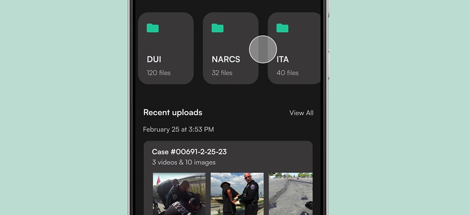 We designed three core features to enhance bodycam footage management: a searchable folder page, user functions for viewing and uploading media to individual cases, and acentral hub for monitoring updates on processed footage.