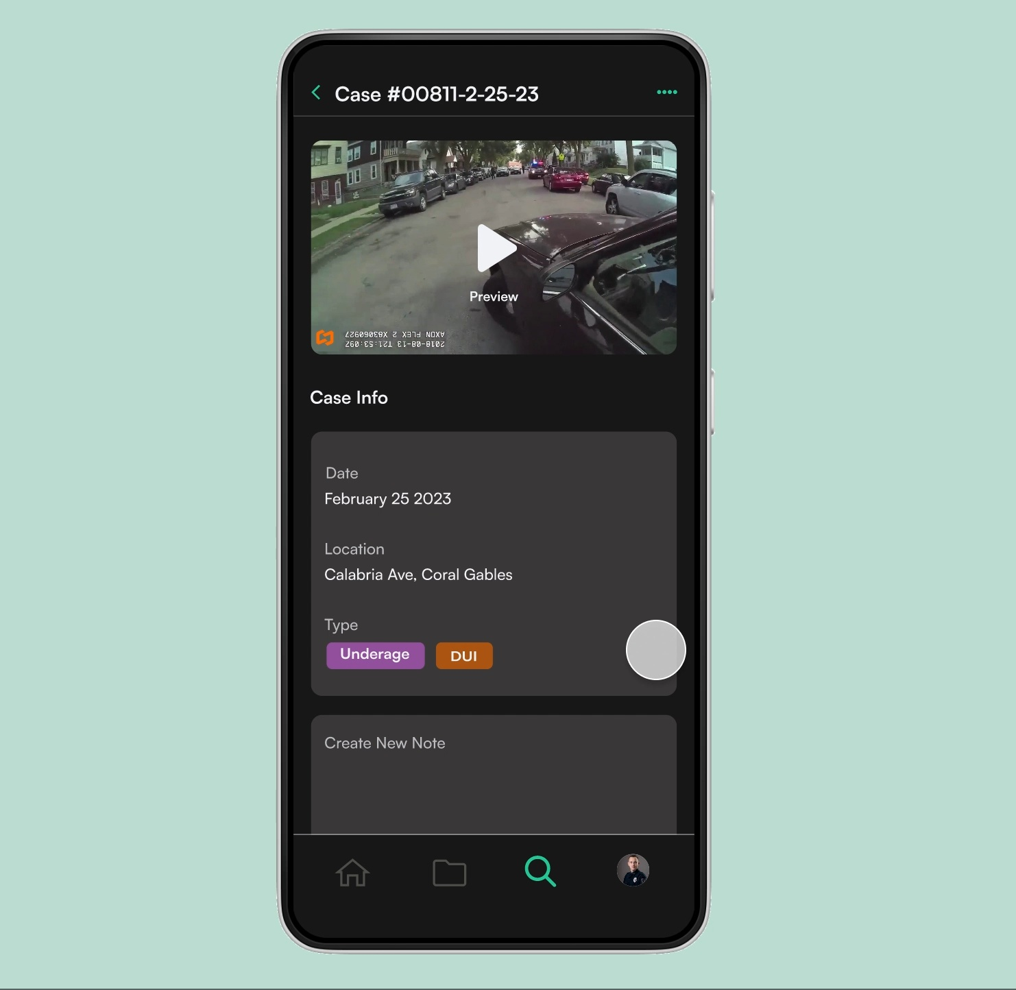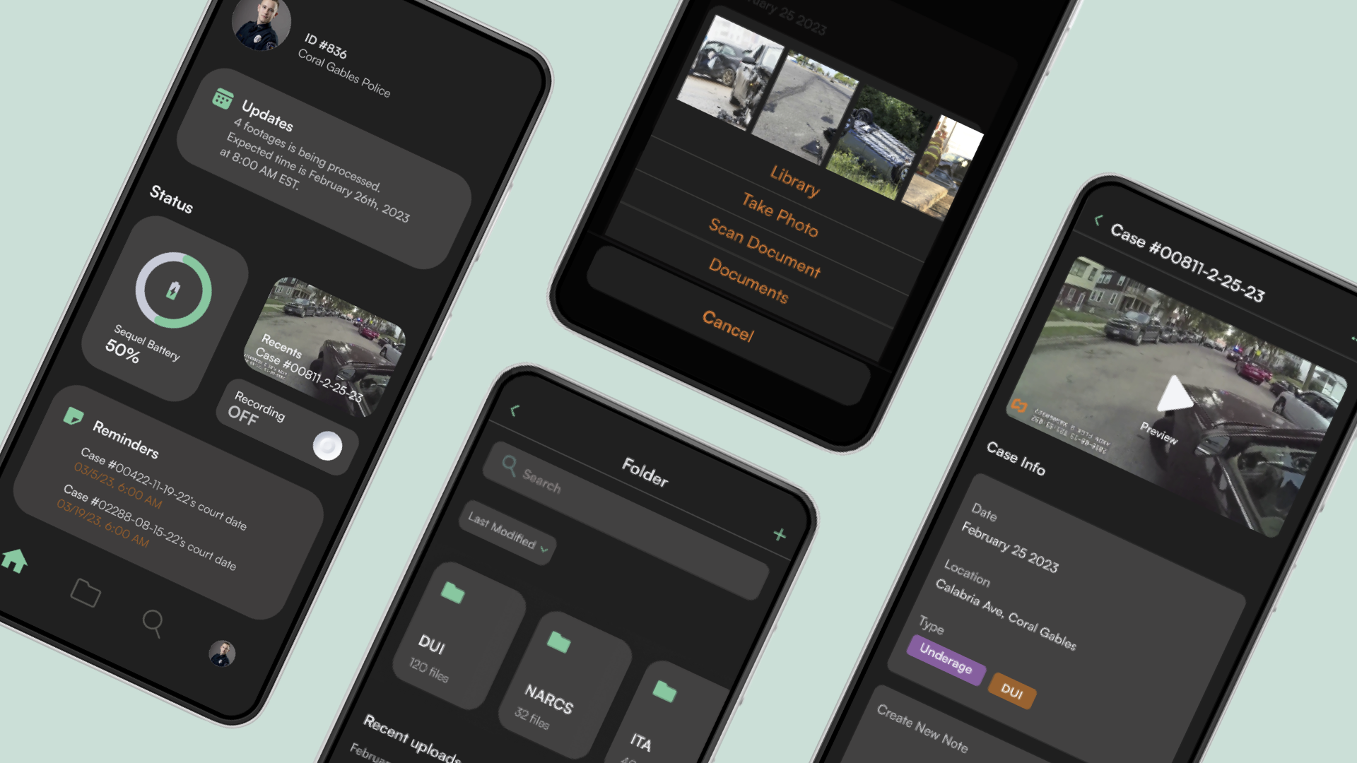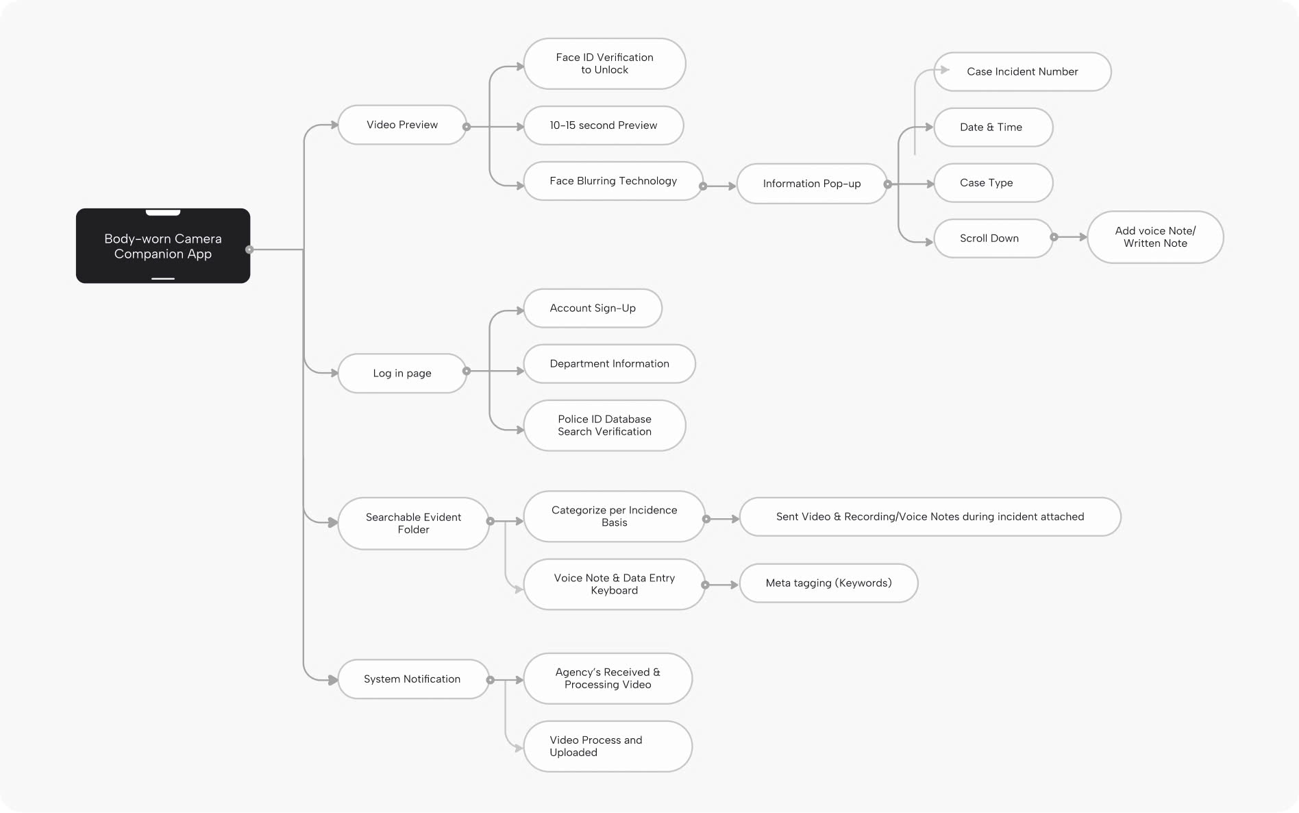 We designed three core features to enhance bodycam footage management: a searchable folder page, user functions for viewing and uploading media to individual cases, and acentral hub for monitoring updates on processed footage.