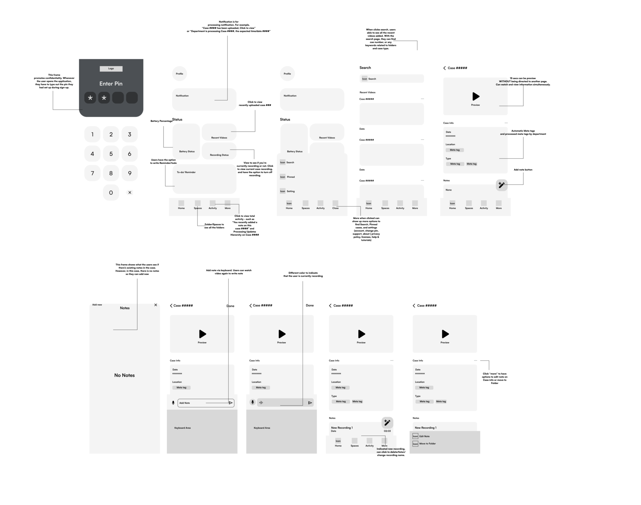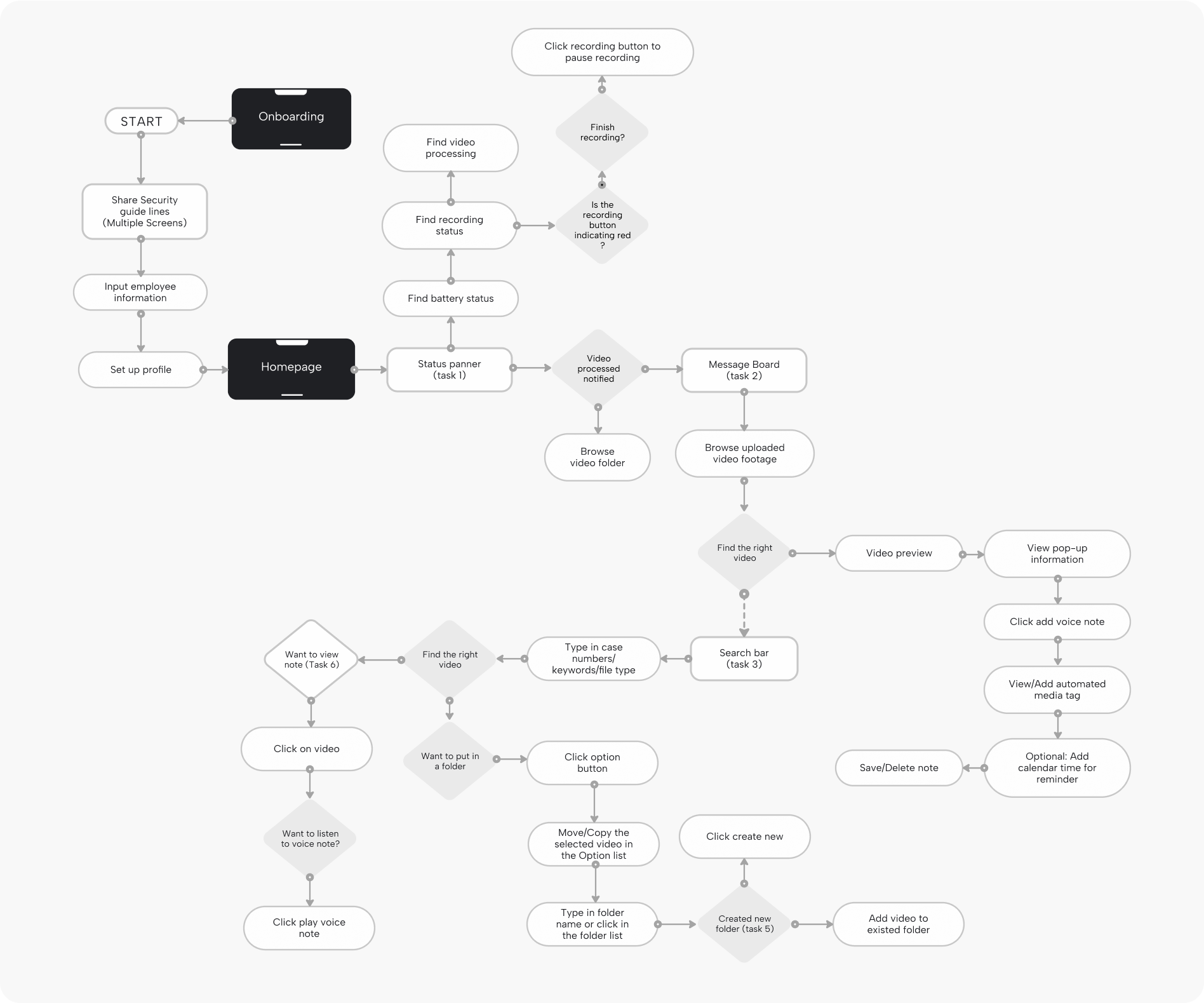 Utilizing task flows helped me in strategically identifying the user tasks to replicate within my prototype. The chart emphasized three pivotal actions: viewing recently processed footage, adding a voice note and media files, and creating a new folder.