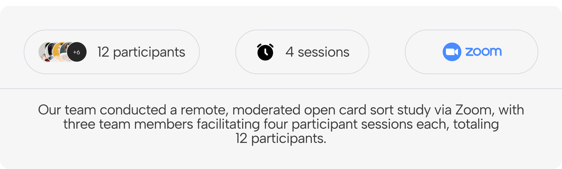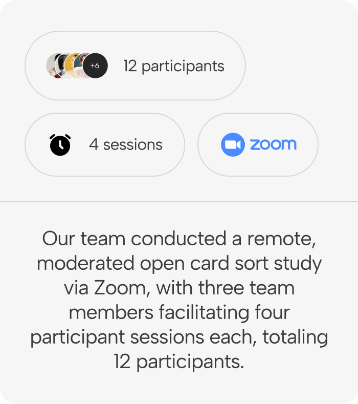 All sessions were conducted remotely using Zoom and OptimalSort. Participants and moderators used personal computers with internet access. Each moderator facilitated four sessions, ensured the study was conducted properly, and documented participant insights.