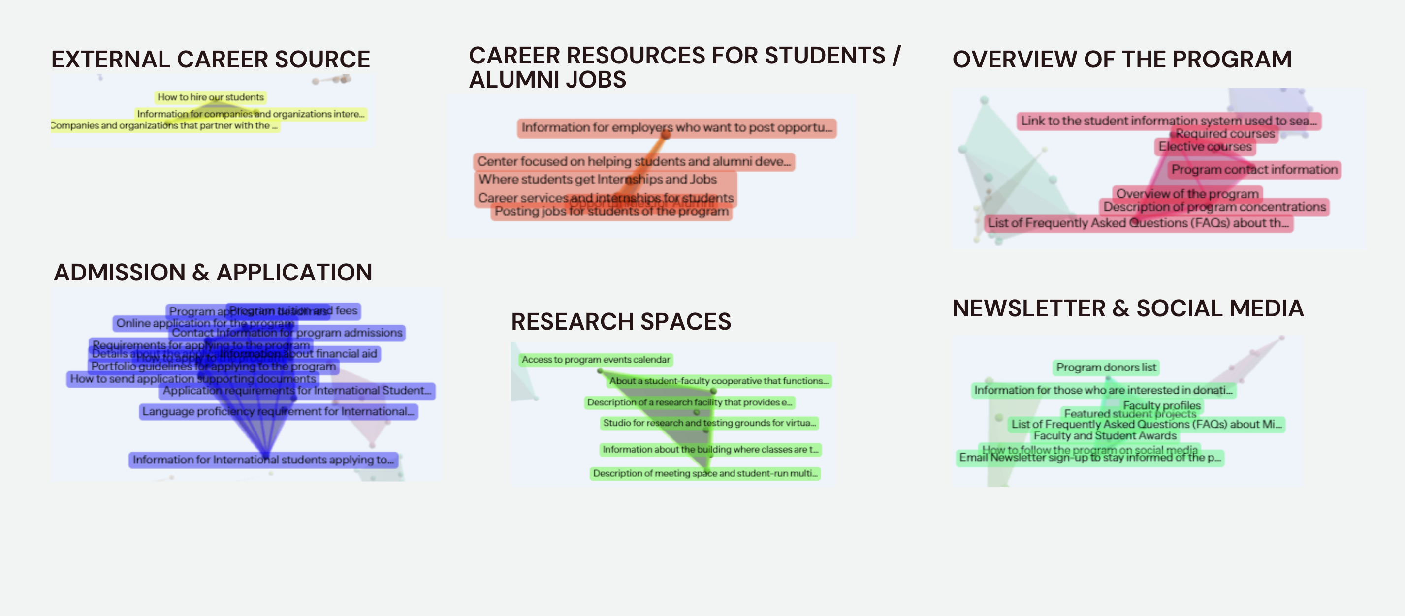 Application requirements for international students" and "Information for international students applying to the program" were frequently paired, reflecting a strong user expectation that information related to international applications should be grouped together.