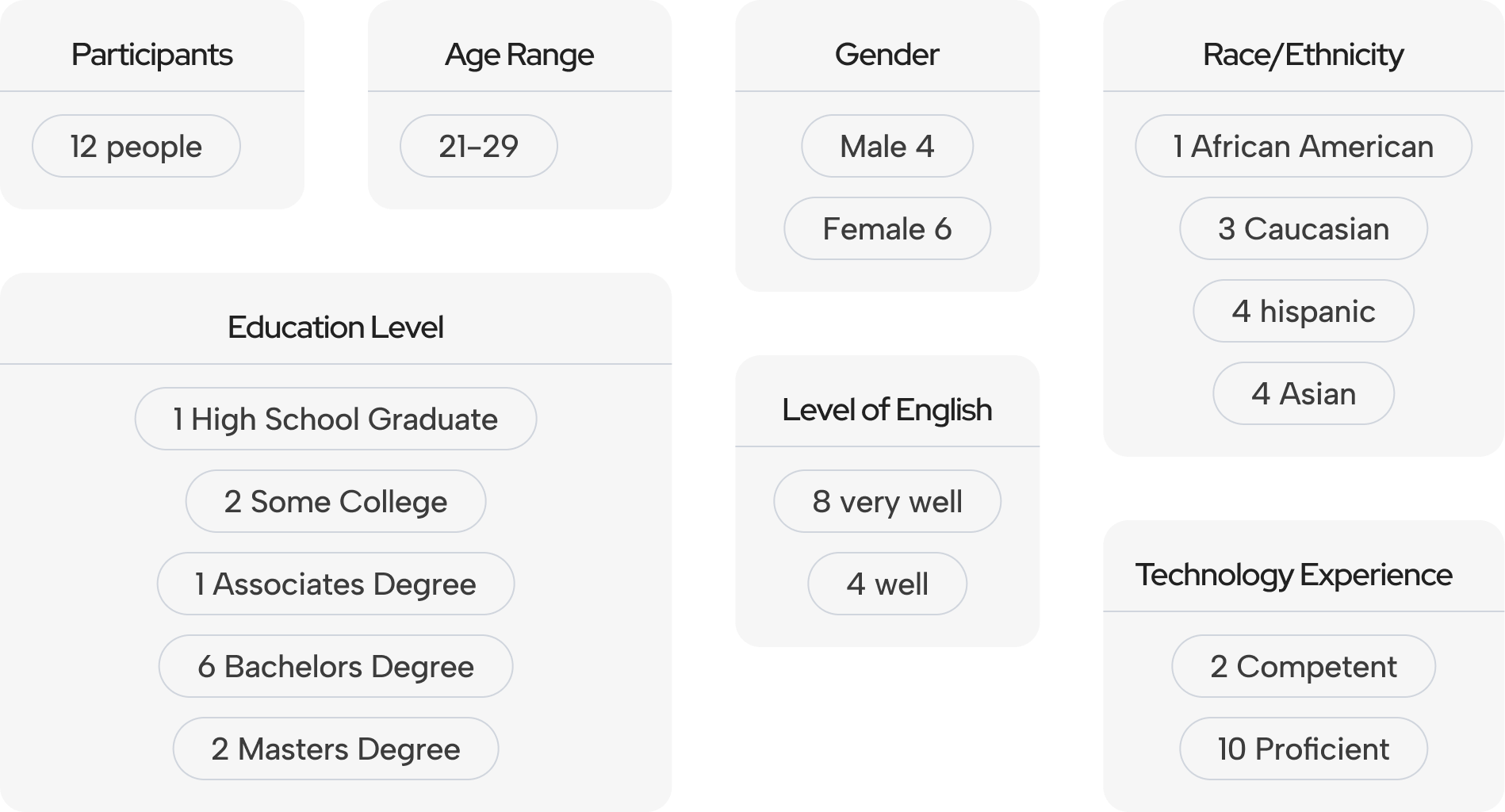 Our pre-sort questionnaire helped us understand our participants' backgrounds, ensuring we captured a range of perspectives to inform our findings. We collected basic demographic details such as age, gender, and ethnicity to identify potential patterns in how different users organize information. Additionally, we gathered insights into their familiarity with technology and UM Interactive Media website to assess how their experience level might influence their sorting decisions. These responses provided valuable context for analyzing the card sort results, allowing us to draw deeper conclusions about user navigation preferences for the UM Interactive Media website.