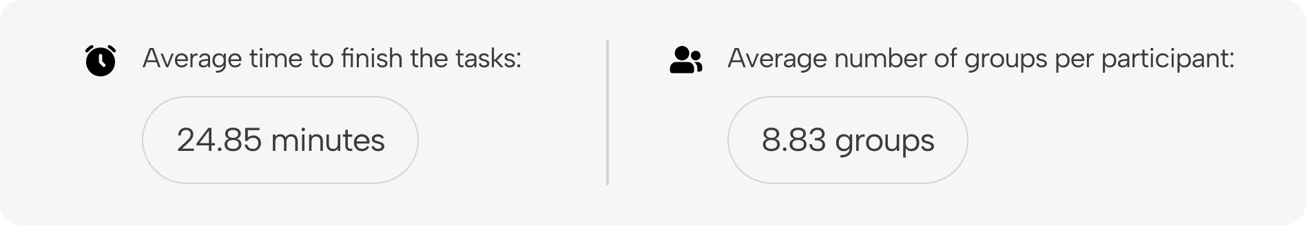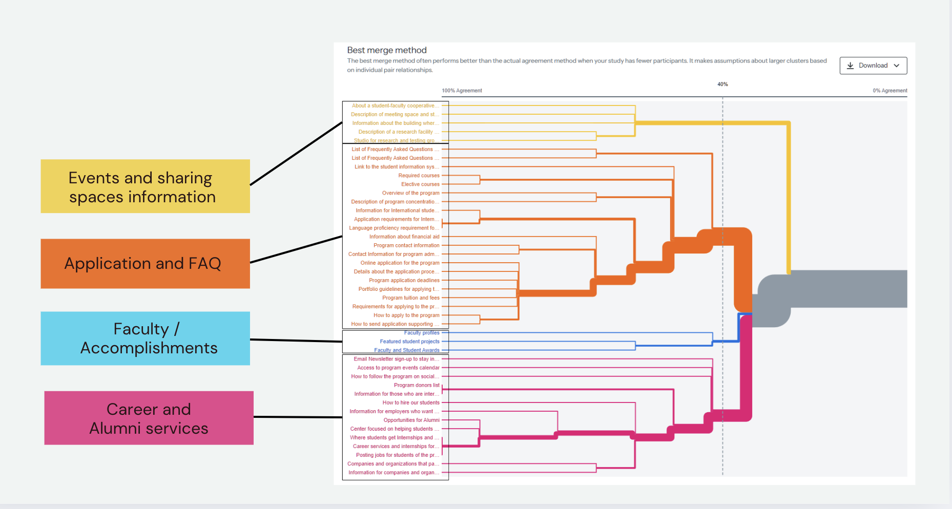 We considered a 40% agreement level as the threshold for identifying meaningful groupings. At this level, four distinct groups emerged, indicating that participants primarily organized content by function rather than audience: