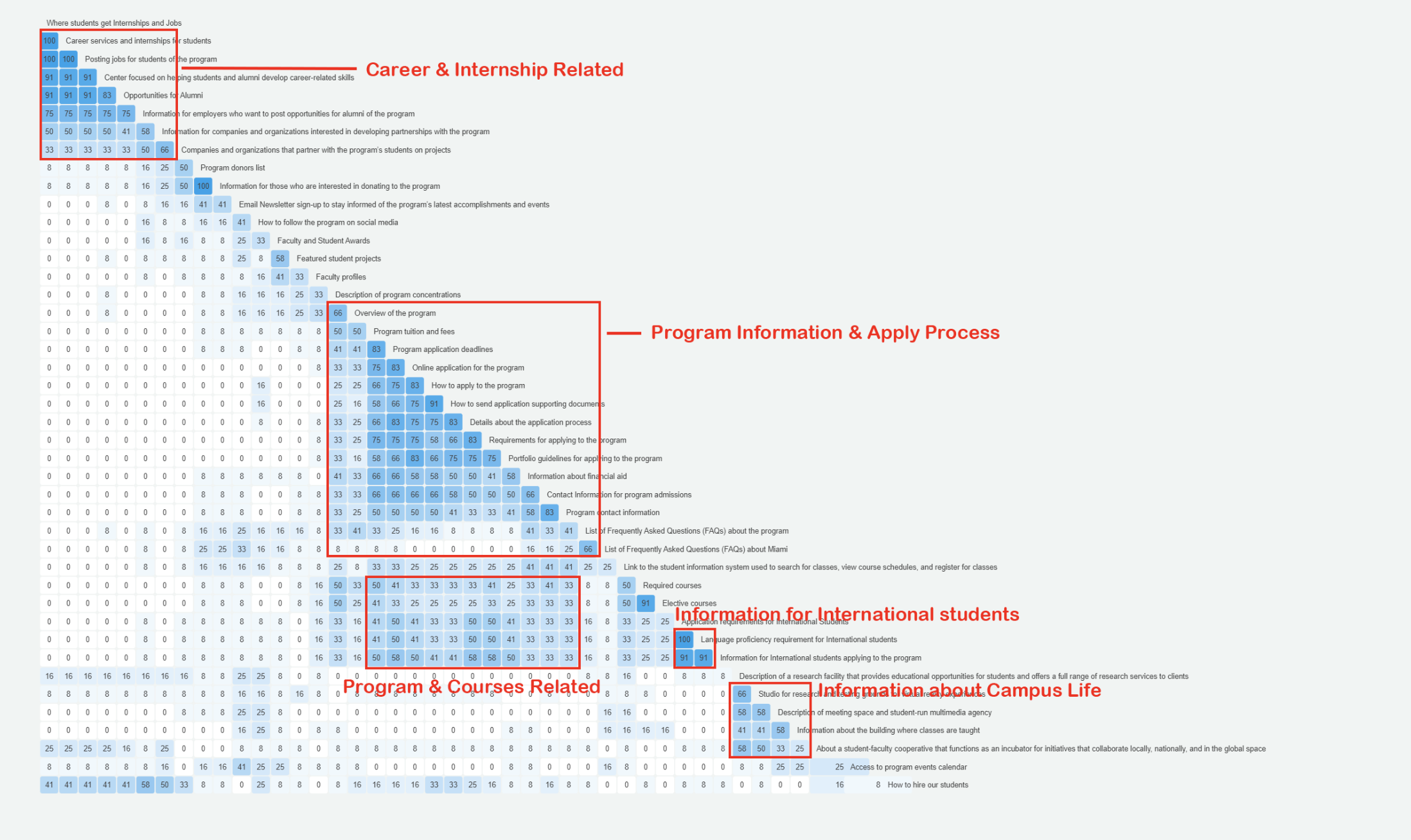 Items like "Career services and internships for students" and "Posting jobs for students of the program" showed a high similarity score, indicating that participants consistently associated career services and job-related content as part of the same category.